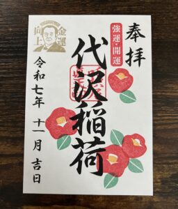左上には、渋沢栄一翁の「金運向上の印」を添えています。かつて代沢稲荷が邸内社であった頃、渋沢翁は客人として屋敷をたびたび訪れたそうです。そのご縁を大切にし、今回の御朱印にも心を込めてこの印を使わせていただきました。